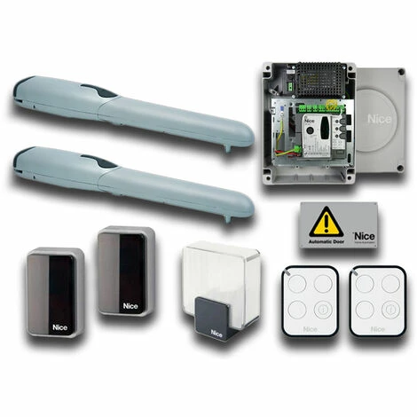 NICE – ANTRIEBSKIT FÜR DREHTORE BIS ZU 2 MT FLÜGELBREITE, FÜR OBERFLURMONTAGE, BIDIREKTIONALVORMONTIERTE MECHANISCHE ENDSCHALTER BEIM ÖFFNENSPANNUNGSVERSORGUNG: 24 VdcWINGOKIT 4024 BD WINGO4024BDKCEUMFASST: – 2 WG4024 selbsthemmender elektromechanischer Getriebemotor, 24 Vdc für Oberflurmontage, mit Schlüsselentriegelung NICE und mechanischem Endschalter beim Öffnen- 2 ON3EBD Sender 433,92 MHz mit 3 Känalen, bidirektional- 1 MC424L Steuerung mit eingebautem Funkempfänger und bidirektionalem OXIB-Funksteckempfänger- 1 EPM Lichtschrankenpaar für Aufputzmontage- 1 ELAC Blinkleuchte LED mit integrierter Antenne- 1 TS Warnschild